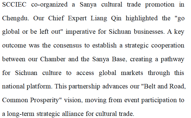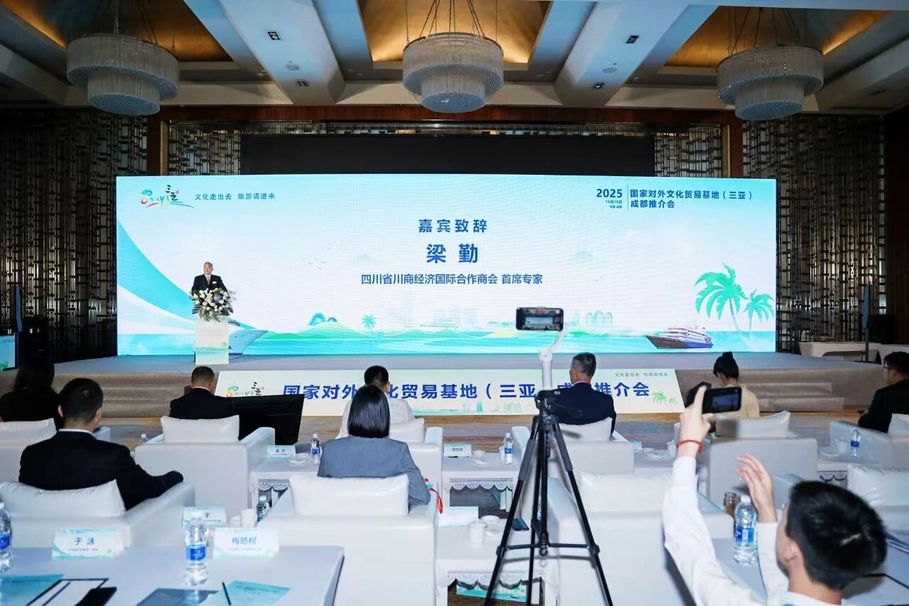 为践行川商国际“一带一路,共同富裕”的愿景,积极推动川企把握国家战略机遇,2025年10月16日下午,由国家对外文化贸易基地(三亚)指导、三亚市旅游和文化广电体育局主办、三亚商务区产业运营服务有限公司承办的 “国家对外文化贸易基地(三亚)2025成都推介会” 在成都首座万丽酒店成功举办。四川省川商经济国际合作商会作为协办单位,深度参与并助力大会圆满举行。