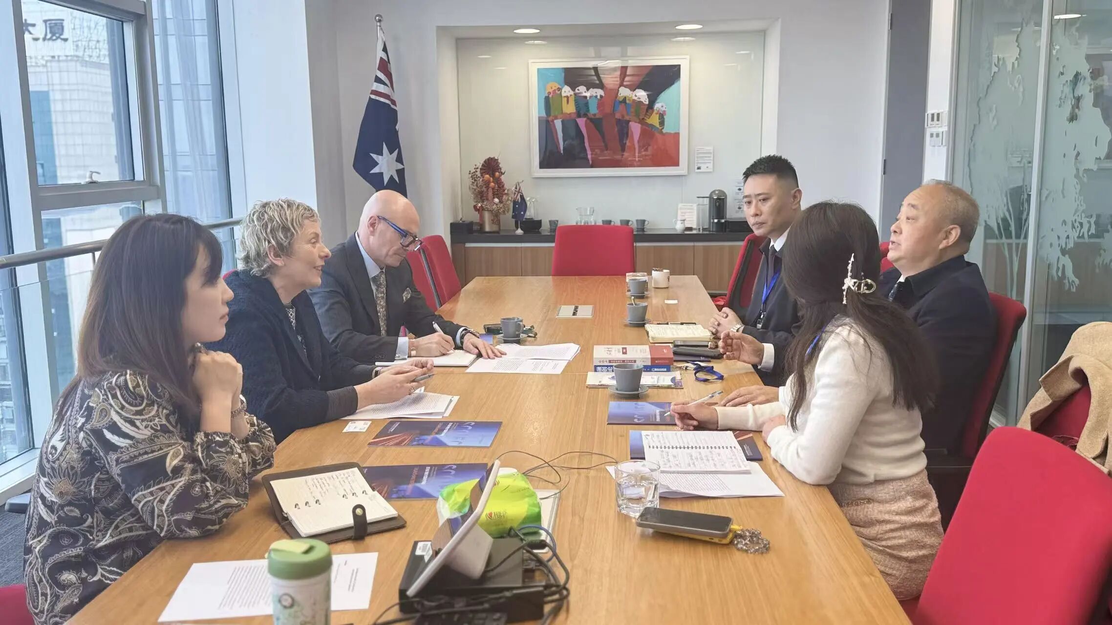 为深入践行“聚合川商 融通国际 创享未来”的核心价值观,积极搭建国际化交流合作平台,3月24日,四川省川商经济国际合作商会秘书处一行拜访澳大利亚驻成都总领事馆,与澳大利亚驻成都总领事馆总领事邵美珍女士(Ms. Meaghan Shaw)、澳大利亚驻成都总领事馆商务副总领事兼澳大利亚贸易投资委员会投资专员费马霆先生(Mr.Martin Ferreyra ) 一行举行了务实友好的座谈交流。